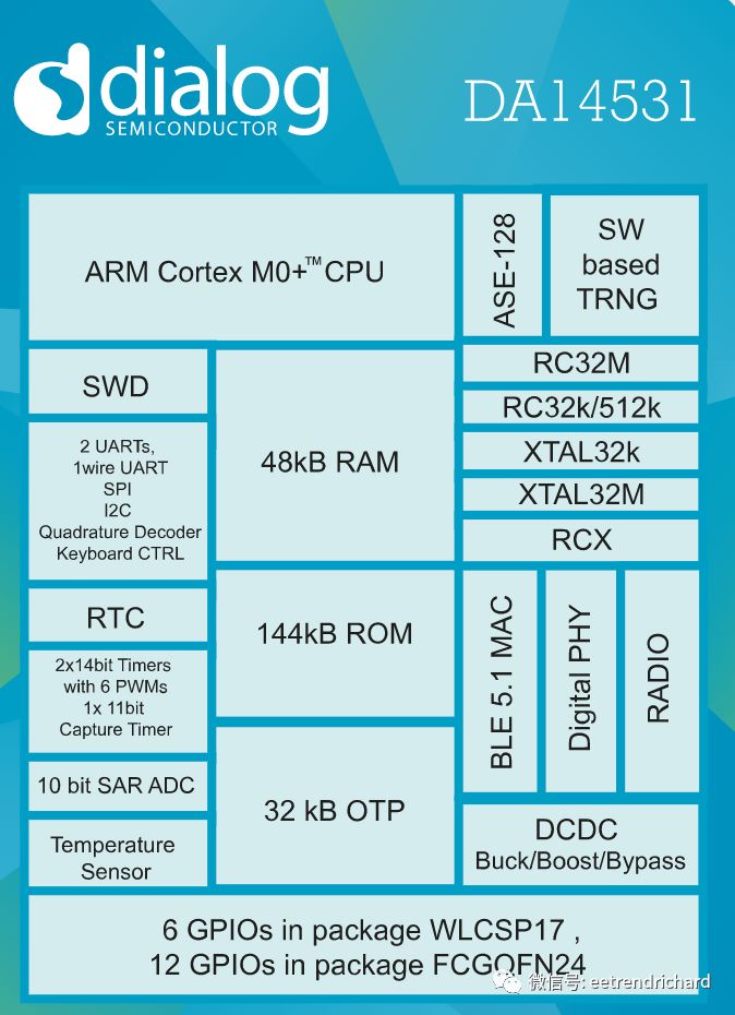 蓝牙低功耗领域的领头羊Dialog半导体公司宣布,推出全球尺寸最小、功率效率最高的最新蓝牙5.1 SoC DA14531及其模块,它简化了蓝牙产品的开发,推动蓝牙低功耗(BLE)连接技术实现更广泛的应用。