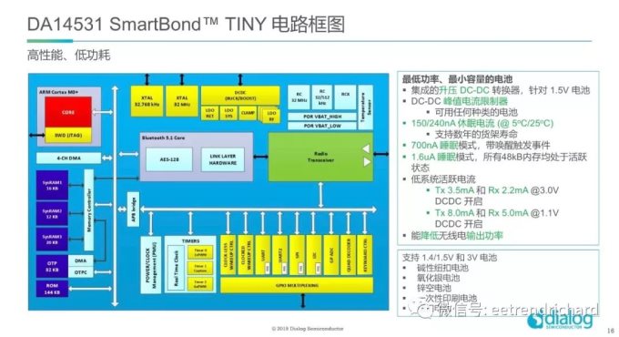 这是SmartBond TINY的框图,它基于强大的32位ARM® Cortex M0+™,支持蓝牙5.1核心规范协议栈,集成了DC/DC转换器,具有集成的内存及一套完整的模拟和数字外设,还支持旁路模式等。它的可编程输出电源是-19.5到-2.5dbM,灵敏度是-94dBm ,它也支持智能唤醒,即便所有的GPIO处于休眠也可以唤醒,它还集成了温度传感器。