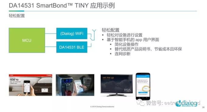 DA14531瞄准很多应用,Mark强调它可以将目前还具备连接能力的设备轻松接入网络,主要目标市场上是连网消费设备:包括信标、智能标签、遥控器、接近标签、连网手表、触屏手写笔、鼠标、玩具、低功耗传感器、以及为现有应用添加“BLE数据传输通道”,还有连网医疗设备:连网注射器、吸入器、血糖监测仪、智能温度贴、血压计、温度计等以及汽车应用:如胎压监测系统、低功耗无线传感器等。它可以轻松对设备进行设置,还方便设备进行联网诊断,这是应用示例。