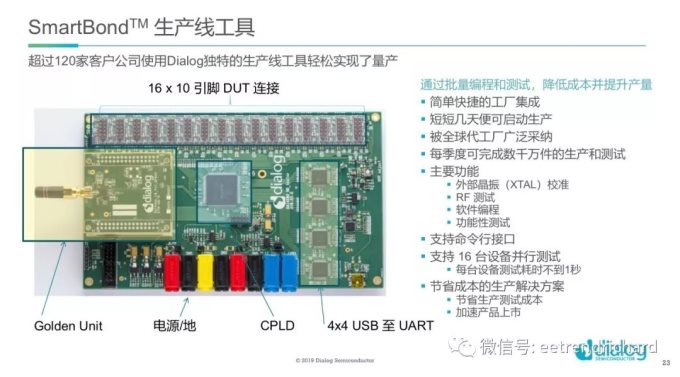此外,他表示Dialog也提供生产线工具,生产线工具包通过以下方式帮助客户节省成本:一是加快生产设置(快速开始生产)二是生产线工具支持16台设备并行测试,每台测试设备测试耗时不到一秒。