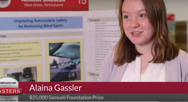 据外媒报道,14岁少女Alaina Gassler在博通大师赛(Broadcom MASTERS,数学、应用科学、技术和工程学领域的新星)上带来了一个名为“通过消除盲点以提高汽车安全性”的项目。