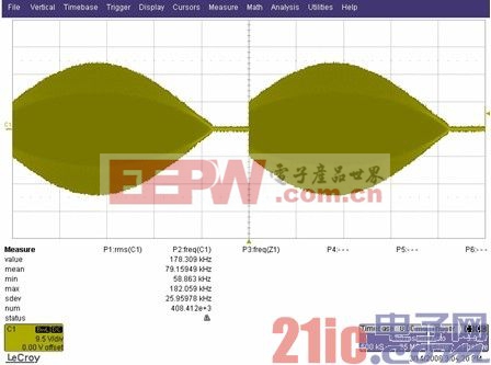 图三是一个实际的测试案例,包络是一系列频率和幅值变化的正弦波信号,客户需要知道频率的最大值和最小值。如果不能稳定触发则每次通过停止波形然后调节测量参数的门限来统计多次测量的最大最小值,非常繁琐。 如果用边沿延迟触发方式同步该波形,测量的门限固定在一个范围内,利用统计功能测量出持续捕获到的包络的频率最大值和最小值。