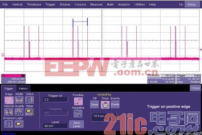 由边沿触发引伸的是边沿延迟触发(holdoff),前面在解释示波器触发的第二个功能时有提到。每次触发到前一个边沿之后,等待设定的延迟时间或延迟事件再触发下一个满足条件的边沿,最长可延迟20s或9,999,999个事件。事件是相对于触发电平而言,在图二的例子中触发电平在图示位置,需要延迟3个事件; 如果触发电平超过矮脉冲的高度,则延迟两个事件。