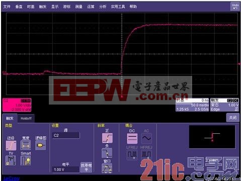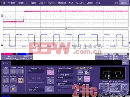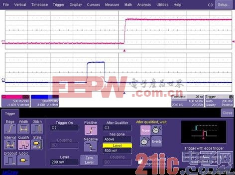 条件触发是两个通道之间的关联触发。 当第二个波形设定条件满足一次后,在第一个波形边沿处触发。图八的触发设置含义是:在C2的上升沿达到触发电平200mV时,触发C2的上升沿但前提是在这之前C3的电平曾超过了500mV。