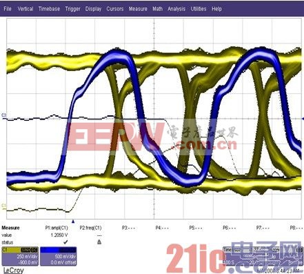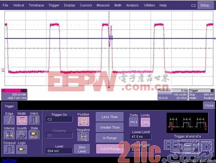 宽度/毛刺触发在实际测试中应用很多。图六的例子中,客户希望稳定显示该波形,能持续测量虚线范围内的信号的眼图,因此,可以用正宽度触发,但触发电平不得高于连续信号的最低值的位置。