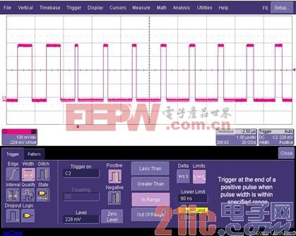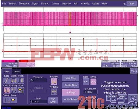 根据相邻的同极性的沿的时间来触发,正到正或负到负。设定的条件也可以小于、大于、在范围内或范围外。图七的触发设置含义是:当穿越触发电平的相邻正沿之间的时间间隔在1.5us到2.5us之间时被触发。 图中一定要将触发电平设置为超过欠幅的矮脉冲,否则条件永远不会满足。