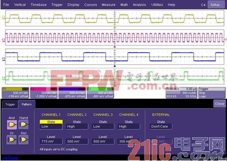 与 (And),非与 (Nand),或 (Or),非或 (Nor)。图十一的触发设置含义是:C1的电平低于775mV,C2的电平高于500mV,C3的电平低于500mV,C4的电平高于350mV,它们同时满足这个条