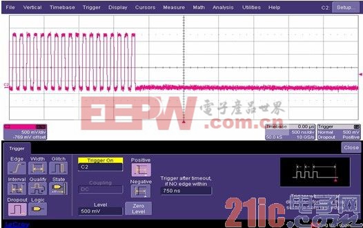 当信号最后的边沿消失了设定的时间后触发。图十二的触发设置含义是:在C2的最后一个上升沿消失之后等待750ns被触发。