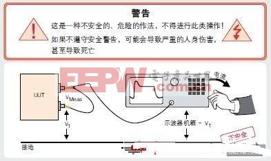 浮地测量,危险电压发生在示波器机箱上。V1可能有几百伏