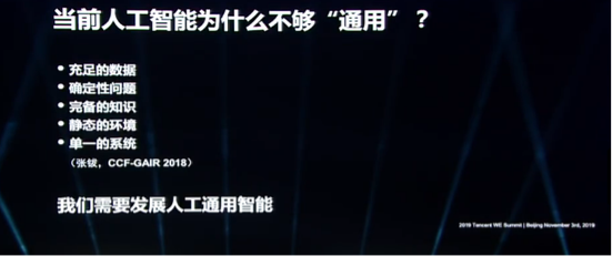 举个例子,如果让智能机器人自主地走向一个目的地,事先不进行编程它是无法做到的,我们人类用了几年的时间建立起这个概念:在哪里、怎么出去、走门、走窗户,所有的这些都与通用智能有关,所以我们的结论是:要发展一个人工通用智能。