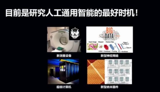 为什么现在是发展人工通用智能最好的时候呢?因为随着精密仪器的发展,人类对脑了解的越来越多,现在似乎到了一个理解脑的关口。超级计算机的发展可以帮助科学家做非常棒的模拟仿真,省钱、省力又省时间的大数据和云计算给科学家提供了一个像脑一样复杂的系统,和脑交相呼应,这样我们就可以共同研究、互相促进。