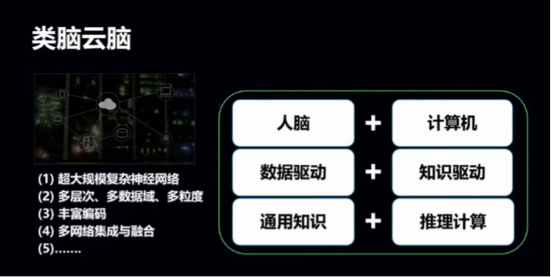 我们现在做的是一个类脑云脑。它和现在的云计算的差别是:云计算是把很多技术整合起来,而类脑云脑是面向人工通用智能的,因为人工通用智能的研究从基本上来讲,不同于把很多人工智能简单的叠加在一起,我们的想法是把脑的弹性和计算机的刚性结合起来,把数据驱动和知识驱动结合起来,把通用知识和推理结合起来。