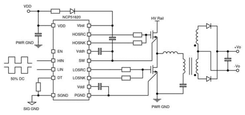 所示的安森美半导体NCP51820驱动器确保门极驱动不重叠,但这可视拓扑需要(如电流馈电转换器)而禁用。该器件还含一个使能输入和全面的保护,防止电源欠压和过温。它采用PQFN、4×4mm的15引线封装,使短、低电感连接到GaN器件的门极。