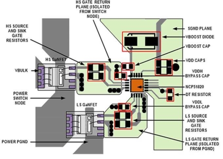 在所有应用中,布板是成功的关键。图4显示了一个采用安森美半导体的NCP51820的示例布板,微型化并匹配门驱动回路。GaN器件和驱动器被置于PCB同侧,通过适当地使用接地/返回面来避免大电流通孔。