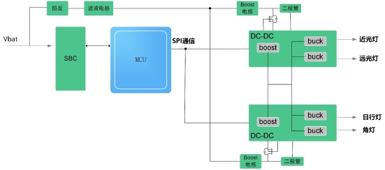 如果客户选择自主研发一整个大灯,而如果每一个功能都选用一个DC电路来驱动,这不仅会增加外围器件的成本(比如电感、防反、续流二极管、mosfet等等),还不利于客户进行平台方案的延伸和后期维护。下面给大家介绍一种大灯方案,这种方案适合客户进行平台化管理和降成本。