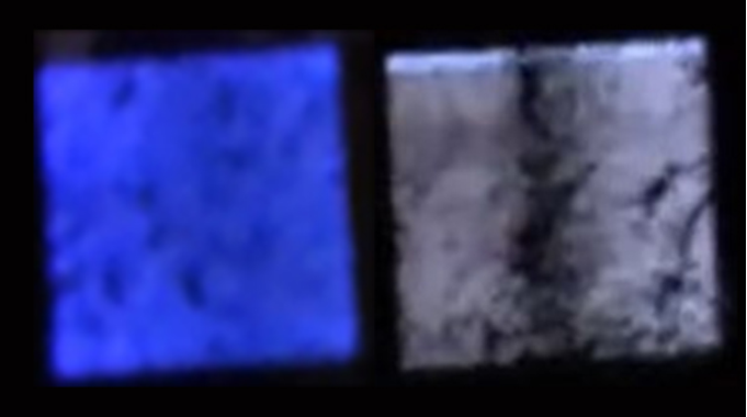 在添加分布式Bragg[1]反射器以产生白光之前(左)和之后(右)显示的一个蓝色发光OLED,反射器将蓝色光转换成两种色温的白光。