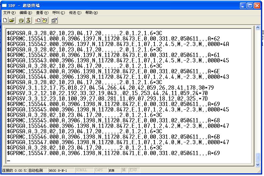 例:$GPGGA,154717.000,3906.1439, N ,11720.8569, E , 1 , 05,1.6, 23.2,M,-2.3,M, , 0000*74
