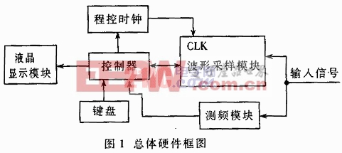 本系统在硬件上可分为五部分:控制器、测频及键盘控制、波形采样、程控时钟和液晶模块。系统功能如图1所示。