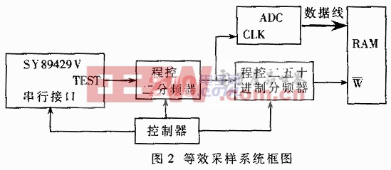 (5)液晶显示 液晶部分由点阵液晶显示器EDM160160、液晶控制器SED1335、SRAMHM62256、负压发生器和背光交流驱动电路发生器组成。 2.2 等效采样的实现 等效采样是本系统的关键和创新点。主要采用以芯片SY89429V为核心的精密时钟发生电路,控制高速ADC对高频信号进行循环间歇式采样。 实现等效采样的系统框图如图2所示。