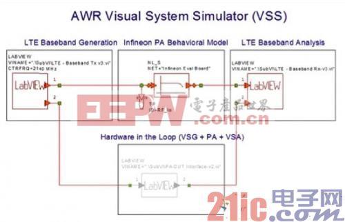 以射频功率放大器为例,LabVIEW可以产生,分析基带LTE信号并可在AWR设计环境中进行测量。应用一个单独的VSS模块,信号可以传递到应用Microwave Office软件在电路级所设计与分析的放大器的仿真模型中。VSS可以管理由LabVIEW得来的信号并为应用Microwave Office软件的基于电路级仿真的功放创建一个系统模型。功放的仿真结果又被送回到LabVIEW中进行解调并对基带信号进行分析。应用MicrowaveOffice软件进行仿真,LabVIEW进行信号处理,VSS进行系统级仿真。可以应用National Instruments的PXI在设计和仿真阶段进行相关的测量。