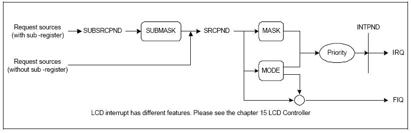 中断源使中断源请求寄存器(SRCPND)的相应位置一,中断模式寄存器(INTMOD)选择是IRQ还是FIQ模式,如果是IRQ,在中断屏蔽寄存器(INTMSK)不屏蔽的情况下,会产生中断,同时中断请求寄存器(INTPND)的相应位被置一。
