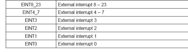 EINT0、EINT1、EINT2、EINT3是四个独立的中断源,而EINT4~7组成一个中断源,EINT8~23组成一个中断源。