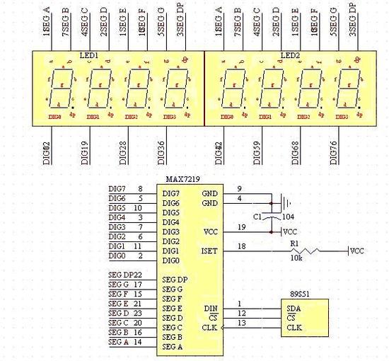 电路原理图如图7,MAX7219与单片机的连接只需要3条线:LOAD(CS)片选引脚、CLK串行时钟引脚、DIN串行数据引脚。其中C1 为电源滤波电容,R1用来设置段电流。 MAX7219的PCB布线有些难度,作者可以提供画好的PCB给读者。有需要的读者请与作者联系。邮箱:zhaoliang_0801@dl.cn