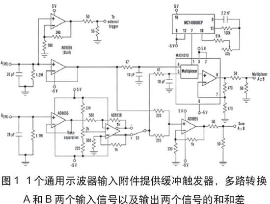 图1所示的附件电路可转换单迹(或双迹)示波器的1个通道工作为双迹单元,具有通常的Add,Invert、Chop和alternate模式。此电路很容易扩展,用MAX4310多路转换器可提供4或8通道。