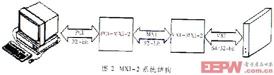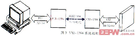 3.2 外接式控制器 VXI总线外接式控制方式是一种灵活而且性能价格比很高的控制方案,得到了十分广泛的应用。根据所采用的外部总线,外接式控制器又有直接扩展和转换扩展两种方式。 直接扩展就是将部分VXI总线信号线直接扩展机箱外作为外总线,连接计算机和VXI机箱控制器,例如MXI/MXI-2总线控制方案。图2给出了一个典型MXI/MXI/MXI-2总线控制方案。图2给出了一个典型MXI/MXI-2系统配置,MXI/MXI-2总线直接将PC扩展总线和VXI总线耦合起来,通过硬件数据传输周期转换,在PC扩展总线和VXI总线之间并行地进行数据传输,具有很高的随机读写和字串行性能。MXI/MXI-2总线还扩展了VXI总线的状态、中断、时钟和触发等总线,是一种高性能外接控制方案。 转换扩展就是用一些跟VXI总线无直接联系的通用总线(如GP-IB、1394、MAX-3、光纤通路等),来连接计算机和VXI总线控制器,从而构成GPIB-VXI、VXI-1394、MXI-3、FOXI等控制方案。图3给出了一个典型的VXI-1394系统。由于这些外总线通常都是串行的或者位数很少的并行总线,数据传输过程中需要作大量的总线转换工作,首字节延迟较长,随机读写和字串行性能较低。并且采用这些控制方式的计算机不能直接访问VXI总线的状态、中断、时钟和触发等信号线,系统的实时性和同步性能要受到影响。但是这些系统的组建成本通常都相对较低,GPIB-VXI系统可利用已有的GPIB仪器,VXI-1394和MXI-3系统的块数据传输性能高,MXI-3和FOXI总线的工作距离远,因此它们适合在一些性能要求不是很高、经费不很充裕或者有特殊要求的场合中应用。