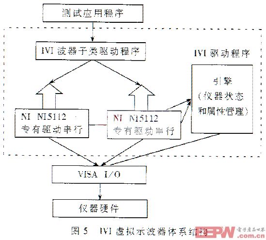 4.3 可互换虚拟仪器(IVI) IVI技术试图提供一个仪器驱动程序标准,为可互换的仪器提供了一个健壮的框架,并着力解决困优测试系统开发者的仪器性能问题。IVI规范把仪器分成一个系列的子类,例如DMM、示波器、开关等,并按照某一子类仪器最通用的特征和功能来为该子类仪器制定规范。IVI建立在VISA I/O层以上,把传统的仪器驱动程序分成子类驱动程序和仪器专有驱动程序两个子层。专有驱动程序执行传统的仪器驱动程序功能,但是具有性能优化的低层结构和仪器仿真功能。子类驱动程序包含该类仪器的通用功能函数,这些函数直接调用相应的专有仪器驱动程序函数。图5给出了一个采用IVI技术的虚拟示波器体系结构。 “软件就是仪器”是虚拟仪器带给仪器工业的一次革命。虚拟仪器的硬、软件的开放性、模块化、可重复使用的特点,同时借助于VXI总线的系统结构这一构筑虚拟仪器的理想的平台,虚拟仪器系统必然会给现代控制测试领域带来一片新天地。