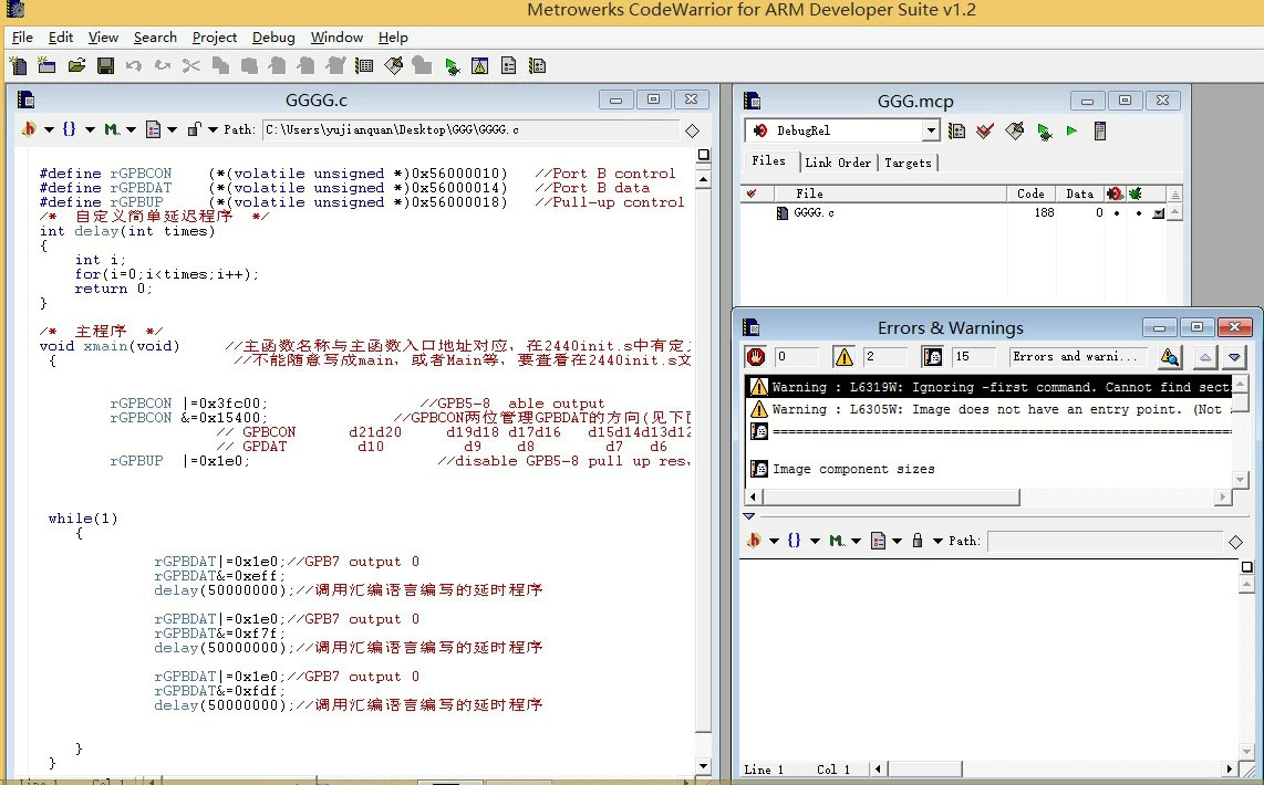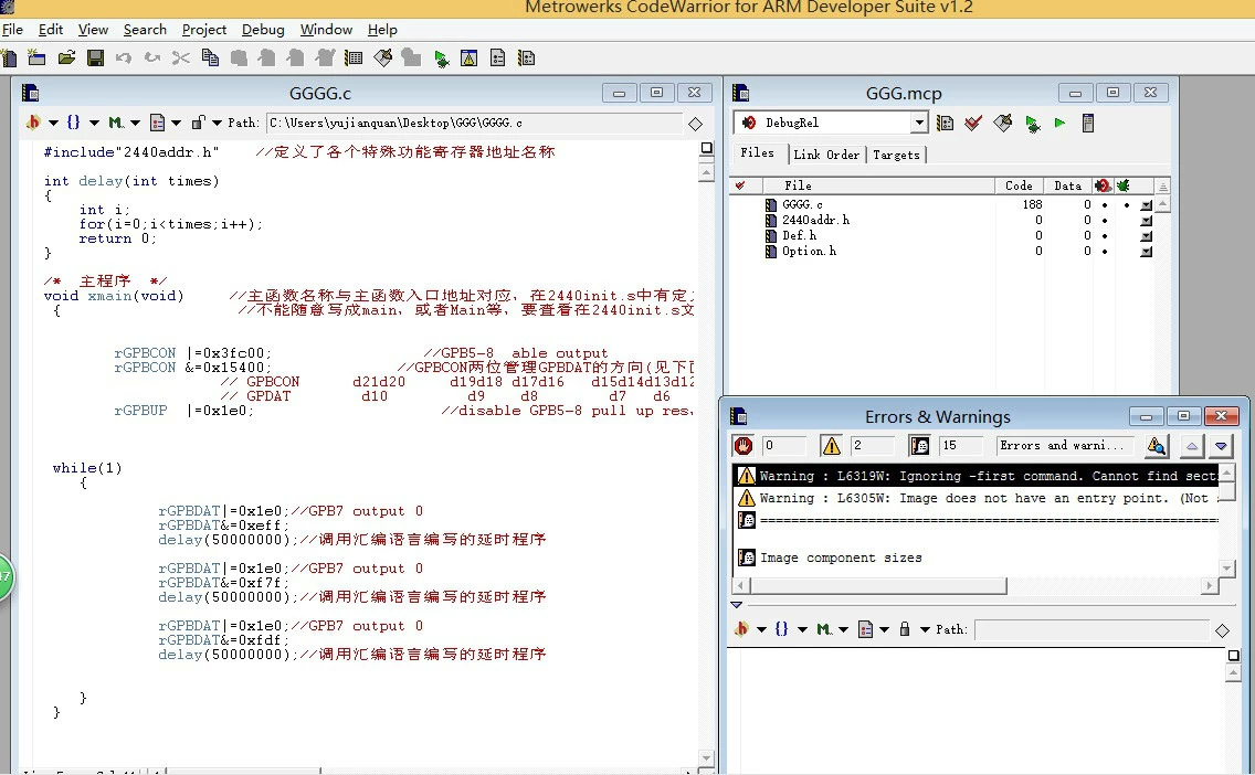 下图是不定义sfr,但必须使用头文件2440addr.h,由于头文件2440addr.h中的设置在Def.h和Option.h中进行了设置,所以,调用2440addr.h必须调用后两者。否则编译出错!