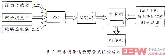 为了研究竖直蒸发管高温多效海水淡化(VTEMED)系统的工艺流程和关键工艺技术及稳定运行时的热工水力学参数影响等,清华大学核能与新能源技术研究院建立了大型双塔4效高温多效海水淡化实验装置。为了测量各部位的温度、压强及流量等热工参数,建立了基于虚拟仪器的海水淡化实验测控平台。使用高精度数据采集板及计算机等并在LabVIEW平台中实现了将传感器及热电偶的电压信号采集、输出、存储和分析。
