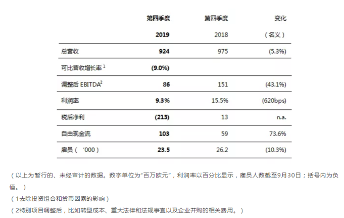 (以上为暂行的、未经审计的数据。数字单位为“百万欧元”,利润率以百分比显示,雇员人数截至9月30日;括号内为负值。)