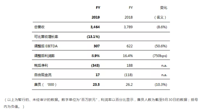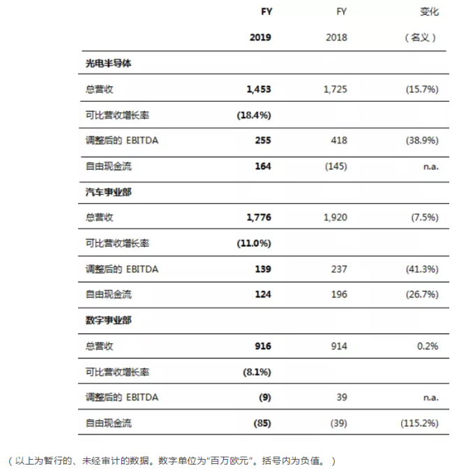 欧司朗集团(持续经营)2019财年关键财务数据