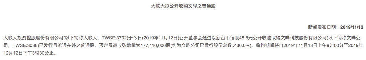 大联大投资控股股份有限公司于2019年11月12日召开董事会通过以新台币每股45.8元公开收购取得文晔科技股份有限公司已发行且流通在外的普通股,预定最高收购数量为177,110,000股(约为文晔公司已发行股份总数之30.0%),收购期间将自2019年11月13日上午9时00分至2019年12月12日下午3时30分止。