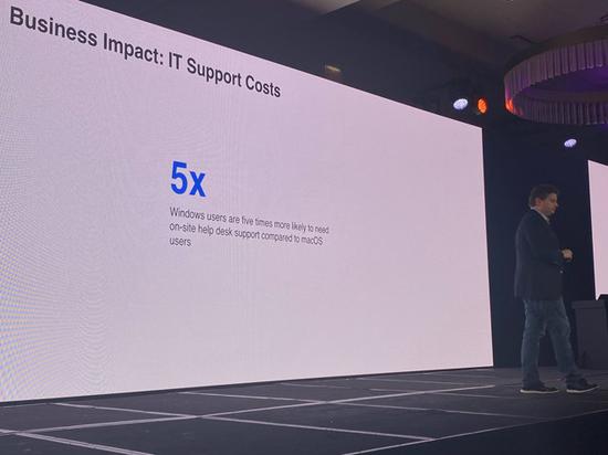 另外,Previn还谈到了在工作场支持Mac的成本。一个由7名工程师组成的团队需要维护200,000台Mac电脑,而如果是维护同等数量的Windows PC则需要一个由20名工程师组成的团队。