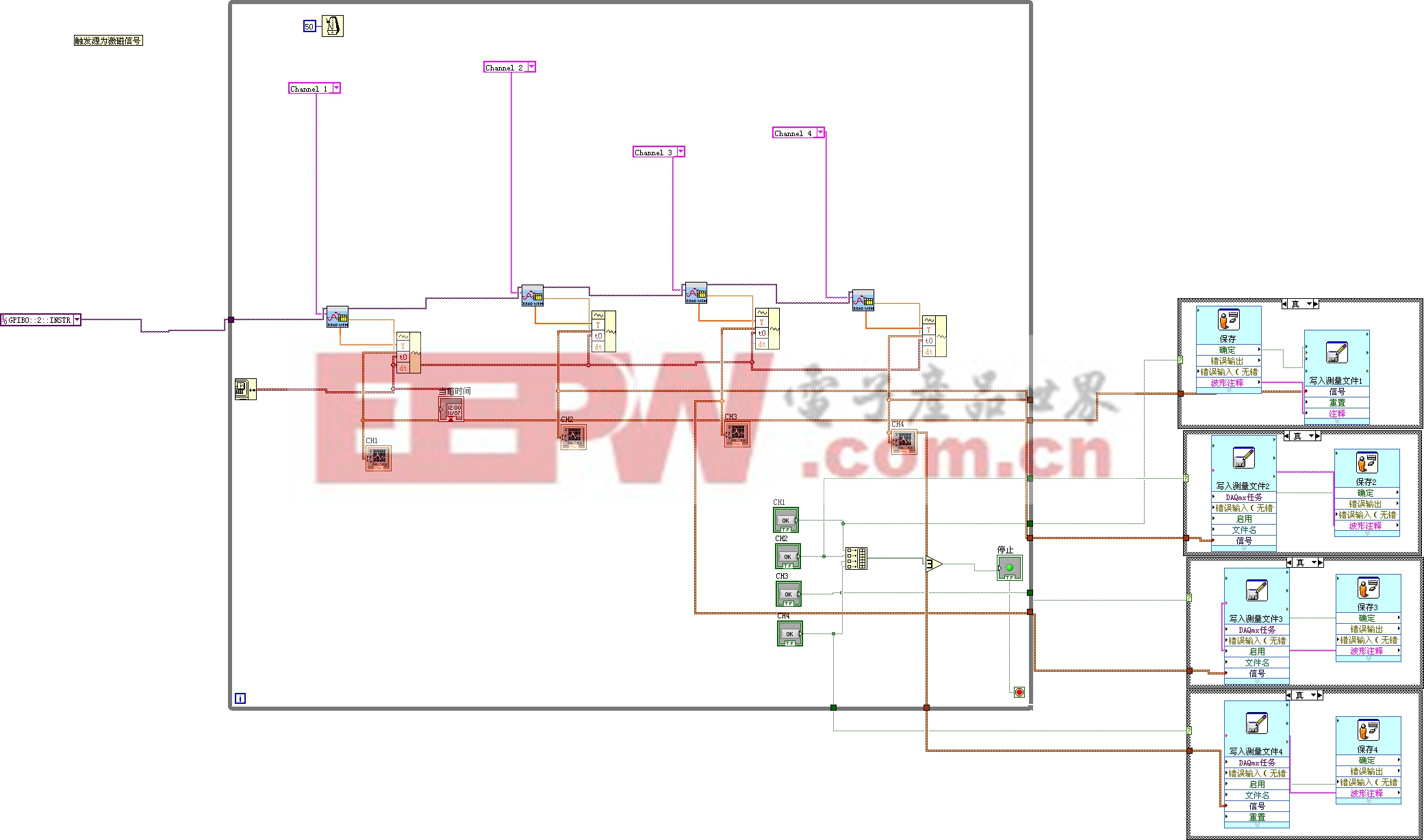 在实际使用中,一直有个问题困扰我,在一些故障讲演和存档时,很难把波形给存到PC中,原来标配有软驱,一张1.44的软盘也就存个5个屏吧,作一次实验得带一盒盘去,操作相当麻烦,还经常出现软盘存完后无法读取的问题,现在单位PC机上软驱几乎绝迹了,示波器的特征曲线有一阵子被逼到用相机拍摄存档。示波器在购买时也购有通讯模块,也一直想通过与PC机联机操作,可是一想到麻烦的编程工作,都让我头疼不已。最近接触了Labview,使我一下子掌握了相关的技巧,而且不仅仅是保存这么简单,还可以实现长实间记录及自动判断保存,使得一些试验工作无需用人首先是联接:示波器上当然要有通讯模块喽,一根串行线(GPIB就更好了),将示波器与PC联机。下一个Labview软件(评估版)也好用,然后下VISA的驱动,如果不想费事的话再下示波器的驱动事实上也是在Labview上开发的,自己看书也可搞定)就这两步将软硬件搞定。