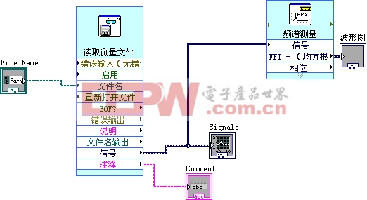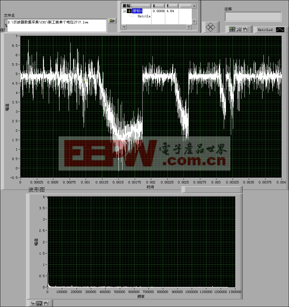 然后就是拉图图框,图形化编程效率真是高的很也简单的很。写一个保存的程序,可以将数据存成Excel文档,包括写入一些备注信息和时间。如果不想在Excel下还原曲线的话,可以写一个读写程序直接还原曲线,所有数据都可以读,可以细化任何细节,我还作了一个FFT,这比原先用软驱拷屏要好的多(拷屏的数据不能读)。