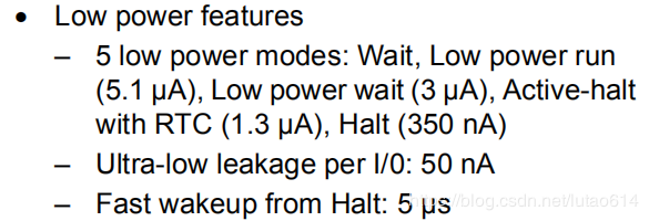 halt模式下可以达到350nA,可以说是非常省电了。从Halt模式唤醒的时间也非常快,只需要5us。