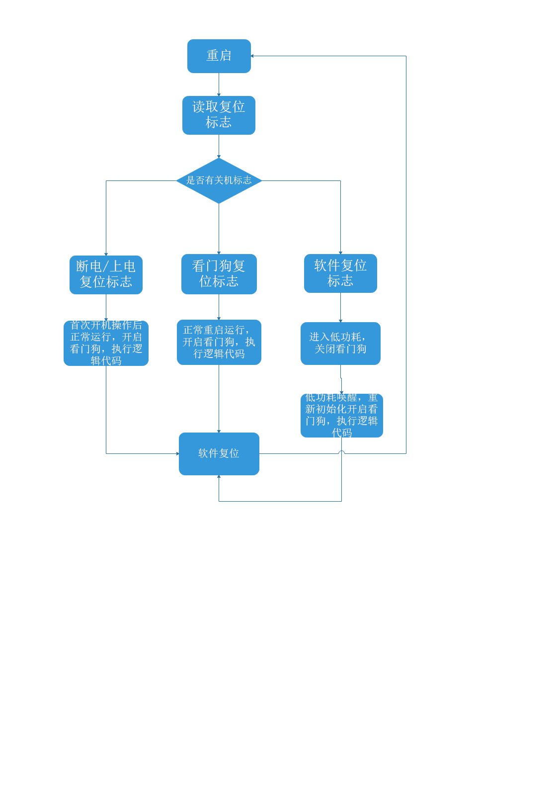 重点记录使用复位状态关闭看门狗。在stm32中,使用RCC的CSR寄存器根据状态位可以判断出复位原因。我在项目中判断了三种状态:上电/掉电态,看门狗复位态,软件复位态。下图流程图可以看出软件每次重启都读取复位标志位,由于业务需求,需要在首次开机时写入一些参数,根据业务需求开关机判断可有可无。 看门狗复位态指没有正常喂狗引起的复位,而软件复位态是我们通过代码手动软件复位的,因此是看门狗复位还是软件复位就可以区分。区分出来后,我们需要做相应处理,如果是看门狗复位态,说明程序跑死了,该让他正常初始化的初始化,养狗的养狗,最重要的是在业务代码完成后进入低功耗前,我们需要进行一步手动复位操作,这个操作用来判断我们是否想进入低功耗,我在程序中的做法是:在进入低功耗前进行软件复位,复位后判别出是软件复位标志,直接goto到低功耗处理函数。在这个goto的过程中没有进行开启看门狗操作,系统复位过,狗就这样子被我们关闭了,成功进入低功耗。