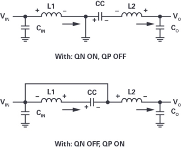 图1所示为双象限电源LT8714的电路图。动力系统由NMOS QN1、NMOS QN2、PMOS QP1、PMOS QP2、电感L1、电感L2、耦合电容CC,以及输入和输出滤波器组成。电感L1和L2是两个分立式非耦合电感,可以降低变换器成本。