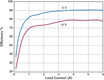 图3.变换器效率曲线:VIN为12 V,VOUT为+5 V和–5 V,最大IO为6 A。