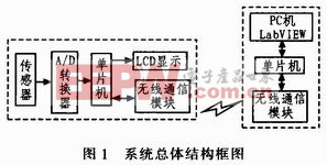 如图1所示,监测系统由单片机监测终端和监测中心PC机组成。其中单片机监测终端由传感器数据采集模块、A/D转换模块、LCD显示模块、无线通信模块等构成。单片机监测终端既可以独立完成各种信息的采集、预处理及显示任务,又能向监测中心PC机传送所采集到的数据信息。监测中心PC机主要完成数据存储、数据显示、数据管理、数据查询和历史资料统计分析等功能。
