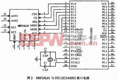 无线收发模块NRF24L01与单片机STC12C5A60S2/AD/PWM的接口连接如图2所示。NRF24L01的MISO脚连接单片机的P1.3脚,其功能是NRF 24L01将接收到的数据解调后输出到单片机中。NRF24L01的MOSI脚连接单片机的P1.4脚,其功能是单片机将准备发送的数据传输到NRF24L0 1,经过调制后发送到上位PC机。NRF24L01的CE脚连接单片机的P1.1脚,CE为使能发射或接收引脚。在CSN为低的情况下,CE协同NRF24L01的CONFIG寄存器共同决定NRF24L01的状态。