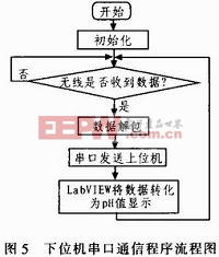 定义串行通信的波特率和通信模式是下位机串口通信的一个重要工作,本系统设计的波特率为57 600位/秒,即上下位机传送数据的速度是每秒发送57 600位。另外,使用的是串行方式1,因此波特率的选择取决于定时器/计数器1的溢出速率和电源控制寄存器PCON。本系统的晶振频率为11.059 2 MHz,可得重装数值N=0xFF。当接收到无线模块传来的采集信号时,下位机便将采集到的数据解包,通过串口传送给上位机,LabVIEW将数据转化为pH并通过前面板显示。其程序流程图如图5所示。