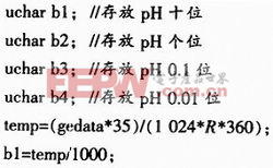 PHG-96FS测试仪的分辨率为0.01 pH,则本系统也将计算得到的pH保留小数点后两位小数,具体的做法为将temp=35*gedata/(1 024*R *36000)的分子乘以100,即temp=35*gedata/(1 024*R*360),其部分程序如下: