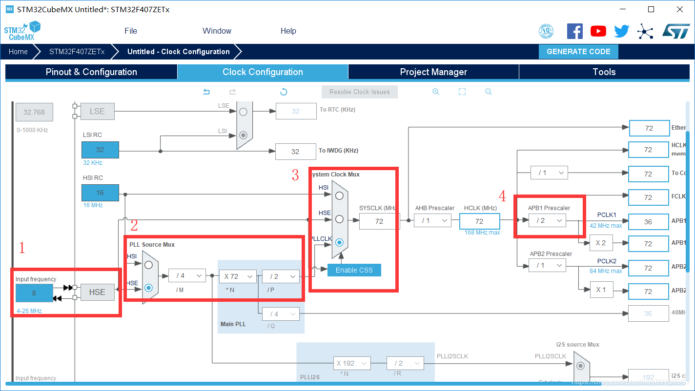 1选择外部时钟HSE 8MHz