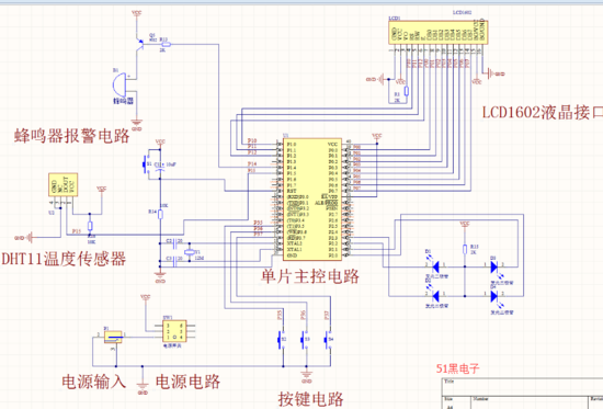 本设计系统是DHT11温湿度报警系统LCD1602显示,可设置温度的高温报警值和低温报警值、湿度的高湿度报警值和低温度报警值,当有报警时蜂鸣器会发出滴滴的报警声,同时绿色发光二极管闪烁,在LCD1602液晶上还能很直观的看到报警信息。并具有掉电保存功能,数据保存在单片机内部EEPOM中,进入设置界面后如果没有键按下系统会在30秒后自动退出设置界面,人性化的按键设置,按键还具有连加、减功能,当按下按键时有按键声即蜂鸣器叫一声,按键声可以进入菜单内设置,可设置按键声打开或关闭。系统还设有取消报警回差值,增加的系统的抗干扰性。
