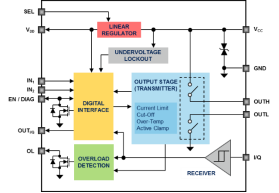 L6362A是符合PHY2(3线连接)标准的IO-Link设备收发器芯片,支持COM1、COM2和COM3模式。这款芯片还支持标准IO (SIO)模式。输出级提供三种可选配置(高边、低边、推挽),能够驱动任何类型的负载(电阻、电容或电感),凡是24V工业传感器都可以连接到L6362A。