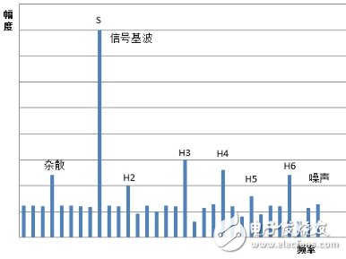 ADC的有效位指标是对正弦波信号进行FFT频谱分析间接计算得到的。图表 2是正弦波经过AD采样再经过FFT变换得到的频域分布图,除了主要的正弦波分量外还存在很多噪声、谐波和杂散信号。